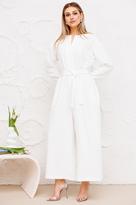 Комбинезон свободного силуэта со спущенным плечом и застежкой на потайную тесьму молнию с переди. Вырез горловины круглый. Рукав втачной длинный. В боковых швах действующие карманы.