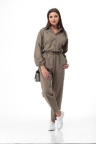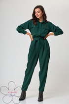 Комбинезон женский повседневного назначения,отрезной по линии талии . Воротник-шалька уходит в линию талии на запах,где фиксирует на пуговицы с обеих сторон. Застёжка центральная на тесьму-молнию. По спинке имеется центральный шов. Расклешение брюк от линии бедер.В качестве декоративной отделки служит съёмный пояс по линии талии.
