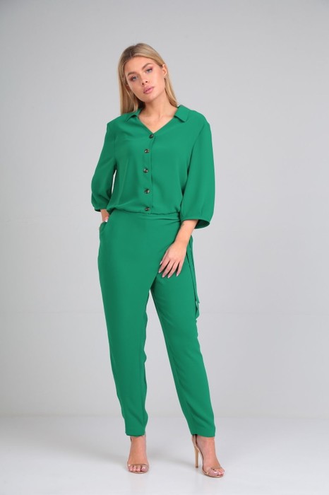 Комбинезон женский,отрезной по линии талии и присобран на резинку по спинке. Рукав 3/4. По переду на брюках одна пола на запах завязывается на талии полупоясом.