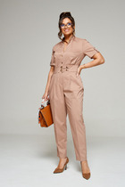 Комбинезон полуприлегающего силуэта, выполнен из костюмной ткани черного цвета. Характеристики: воротник отложной, двойные выточки по талии, по спинке на талии изделие присборено на резинку, рукав втачной, на брендированной подкладке, застёжка центральная - потайная планка с пуговичками. Длина рукава от линии втачивания 63 см, длина изделия по спинке 81 см.