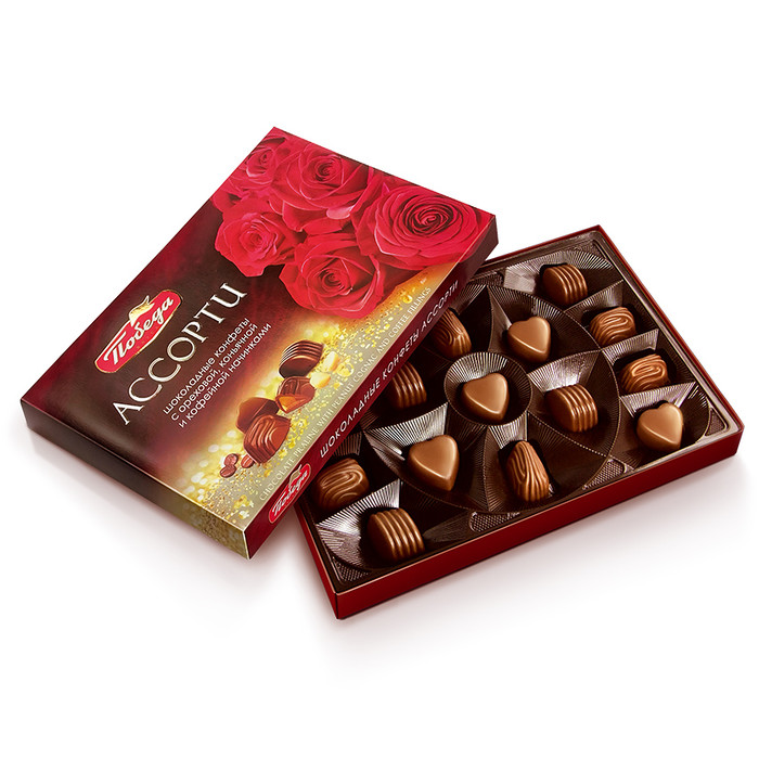 Подарочный набор шоколадных конфет «Ассорти» остаётся актуальным всегда, меняются только вкусы. В этой коллекции «Ассорти» – конфеты с ореховой, кофейной и коньячной начинками. Задорное, меланхоличное и серьёзное — если вы принимаете все свои настроения и не хотите выбирать что-то одно, попробуйте ассорти. Там всё на ваш вкус, каким бы он ни был сегодня. Начинки: ореховая, кофейная, коньячная.