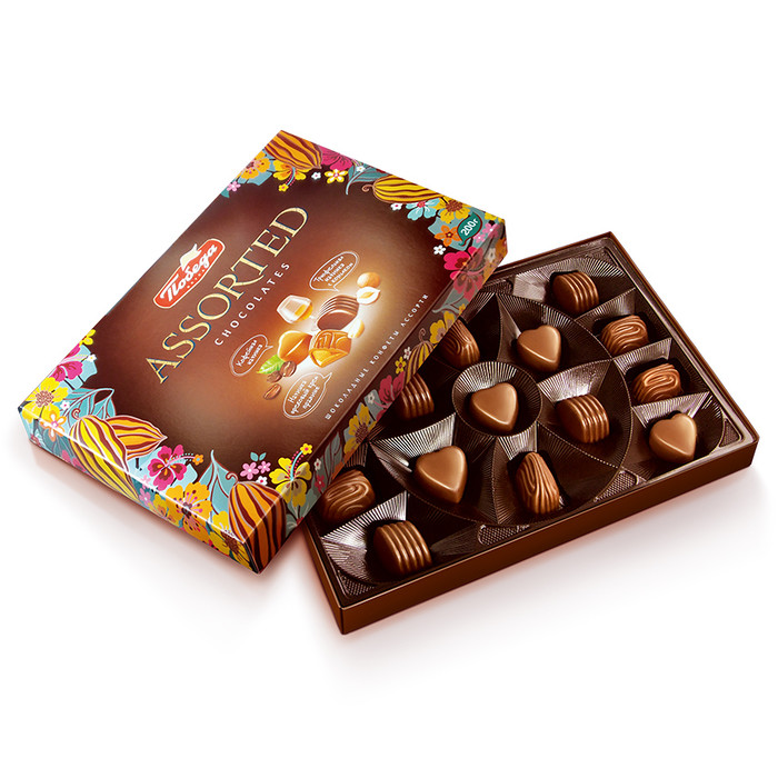 Подарочный набор шоколадных конфет «Ассорти» остаётся актуальным всегда, меняются только вкусы. В этой коллекции «Ассорти» – конфеты с ореховой, кофейной и коньячной начинками. Задорное, меланхоличное и серьёзное — если вы принимаете все свои настроения и не хотите выбирать что-то одно, попробуйте ассорти. Там всё на ваш вкус, каким бы он ни был сегодня. Начинки: ореховая, кофейная, коньячная.