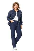 Костюм женский из кулирного полотна состоит из туники и брюк. Туника приталенного силуэта, спущенный рукав, в плечевых швах - вставки из основного полотна. Горловина круглая, на полочке принт. Низ изделия обработан на плоскошовной машине. Брюки прямые, верх на поясе с резинкой, в боковых швах карманы. Низ изделия обработан на плоскошовной машине.