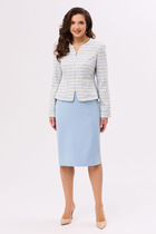Костюм женский из кулирного полотна состоит из футболки и брюк. Футболка прямого силуэта, горловина круглая, обработана окантовкой, спущенное плечо, рукав короткий втачной, по низу изделия кулиска со шнуром, на полочке принт. Брюки прямые, верх на поясе с резинкой, в боковых швах внутренние карманы, низ изделия на резинке.