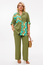 Костюм женский из кулирного полотна состоит из футболки и брюк. Футболка - прямой силуэт, горловина круглая, рукав короткий, втачной, низ изделия обработан на плоскошовной машине, на полочке принт. Брюки прямые, верх на поясе с резинкой, в боковых швах внутренние карманы, низ изделия на манжете.