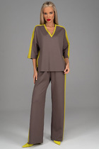 Свитшот со спущенной линией плеча, с фигурным карманом по низу. Вход в карман обработан обтачкой из рибаны. Манжеты, пояс и обтачка горловины из рибаны в тон основного материала. Брюки прямого силуэта, длиной до щиколотки, с поясом на резинке. Данная модель это отличный повседневный вариант, хорошо подойдет для путешествий или активного отдыха на природе.