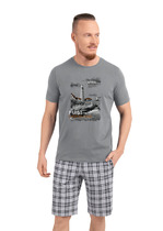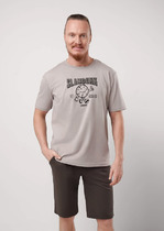 Костюм мужской футболка с шортами. Футболка прямого силуэта, рукав втачной, на верхнюю часть рукава настрочена репсовая тесьма с буквами. На полочке стильный принт. Шорты прямые, немного ниже колена, с боковыми внутренними карманами