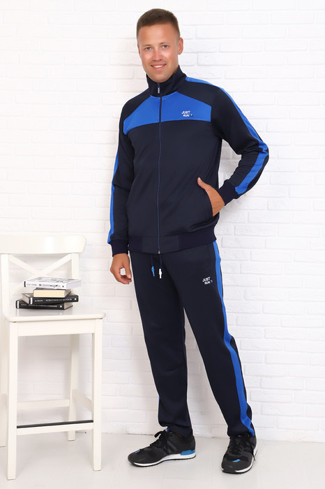Мужской костюм. Кофта на молнии без капюшона, по бокам карманы. Рукава на манжете. Слева на груди вышивка в виде небольшой надписи. Брюки прямые. Спереди два кармана. Слева под карманом вышивка в виде небольшой надписи.