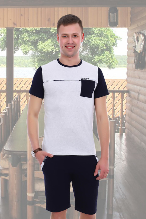 Костюм мужской из кулирки футболка + шорты. Футболка с короткими черными рукавами, темная окантовка горловины, накладной карман. Темные шорты, по бокам карманы со светлой отделкой, длина чуть выше коленей. Несколько вариантов расцветки. Размеры от 44 до 54.