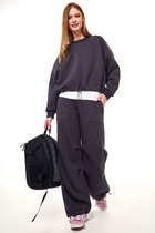 Костюм женский с брюками. Толстовка с капюшоном на завязках, пояс и рукава на манжетах. Спереди принт в виде большой галочки. Брюки полуприлегающего силуэта с боковыми карманами. Верх на резинке, низ на манжетах. Внизу принт в виде надписи.