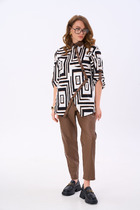 Костюм женский из кулирного полотна, состоит из кофты и брюк. Кофта - прямой силуэт, горловина круглая. Рукав длинный, втачной, внизу на манжете. Низ изделия на поясе. Брюки прямые, верх на поясе с резинкой, в боковых швах внутренние карманы. Низ изделия на манжете. На полочке принт.