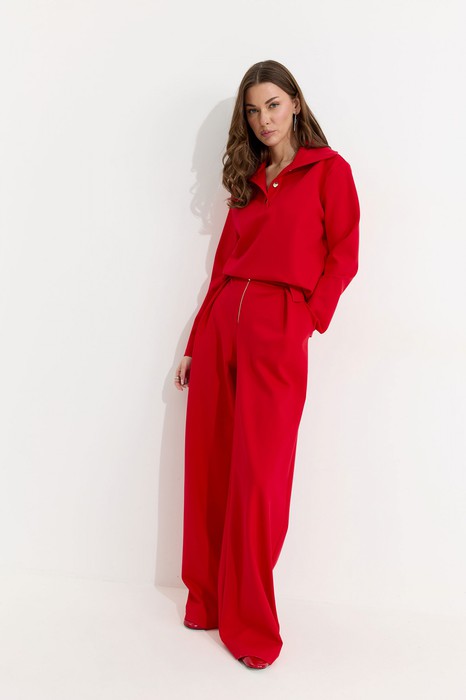 Описание Костюм состоящий из джемпера и брюк. Джемпер прямого силуэта из трикотажного полотна. Воротник - широкая стойка. Горловина с застежкой на петлю и пуговицу. Рукав одношовный втачной, чуть спущена линия плеча. По низу джемпера в боковых швах разрезы. Обращаем ваше внимание, что фурнитура может отличаться от фото. Брюки прямого силуэта из трикотажного полотна. По верху брюк притачной пояс, по переду застежка молния в среднем шве, карманы в боковых швах и декоративные складки. На задних половинках брюк прорезные листочки. По задним половинкам брюк на поясе резинка от вытачки до вытачки. Обращаем ваше внимание, что фурнитура может отличаться от фото.