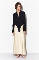 Костюм состоит из куртки с капюшоном и брюк. Брюки на эластичном поясе, с карманами, с фигурными подрезами спереди. Рукав втачной, длинный, на эластичном манжете, с лампасами вдоль рукава. Куртка на молнии, с капюшоном, полуприталенная, с диагональным подрезом и лампасами на полочке, на поясе. Вдоль лицевого края капюшона расположена вставка из контрастного полотна с лампасами.