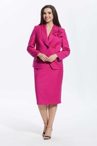 Трикотажный женский костюм из структурной ткани. Жакет прямого силуэта переду центральная застежка на 3-и петли и пуговицы и потайные кнопки. По переду накладные карманы декорированные цепью и застежкой на петлю и пуговицу. Спинка со средним швом без особенностей. Рукава втачные двухшовные. Юбка прямая длиной миди без подкладки. По правому боковому шву разрез. Для максимально комфортной посадки по поясу эластичная резинка.