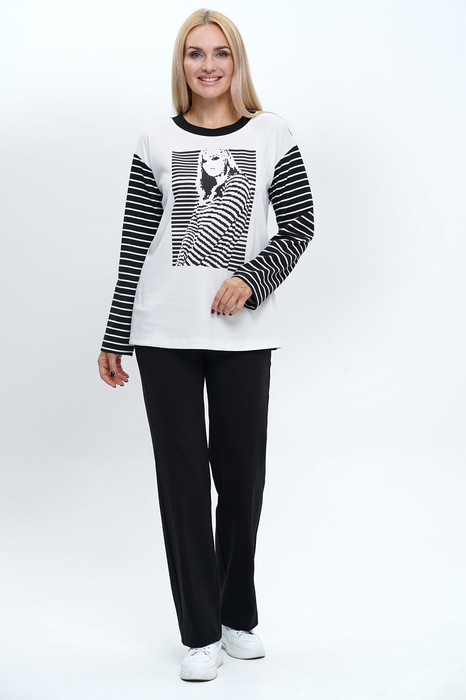 Блузон прямого, свободного силуэта, со спущенной линией плеча, с втачными, одношовными, длинными рукавами. По горловине втачная бейка. Декорирован печатью по переду.