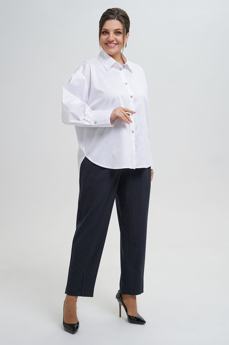 Блузка прямого, свободного силуэта, с застёжкой на петли, пуговицы, со спущенной линией плеча, с фигурной линией низа. Спинка со средним швом с драпировкой, с V- образным вырезом по кокетке. Рукава втачные, одношовные, длинные, понизу с разрезом, с мягкими складками и притачными широкими манжетами на петлю, пуговицу. Воротник стояче-отложной на отрезной стойке на петлю, пуговицу.