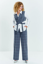 Жилет прямого силуэта, с центральной застёжкой на петли, пуговицы, с притачными кокетками, низ фигурной формы разноуровневым. Перед с нагрудными выточками, с отделочными деталями и декоративными клапанами. Срезы отделочной детали переда, кокетки переда и спинки с необработанными срезами.