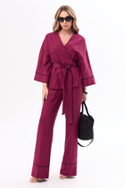 Блузон свободного силуэта, на подкладке, со спущенной линией плеча, без застёжки, с ремнём, с фигурной линией низа, с отлетными боковыми швами. Перед с имитацией воротника апаш. Спинка со средним швом понизу формы «баллон».