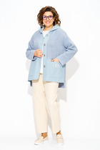 Комплект женский 2-х предметный состоит из блузы и брюк. Блуза прямого силуэта, со спущенной линией плеча, с разно-уровневым низом (спинка длине переда), с разрезами по боковым швам. Декорирована съёмным украшением. Перед с отложными лацканами и мягкой складкой, с нагрудными выточками. Спинка с притачной кокеткой и застёжкой на петли, пуговицы. Рукава втачные, одношовные, короткие.