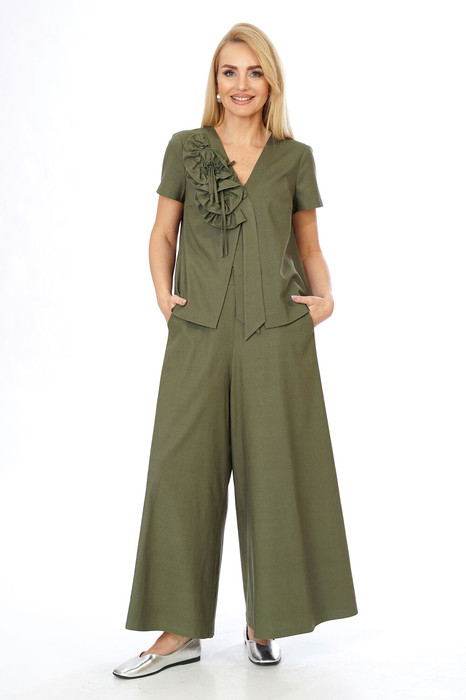 Юбка-брюки А-образного силуэта, на притачном поясе по спинке на резинке. Передние части с косыми боковыми карманами.