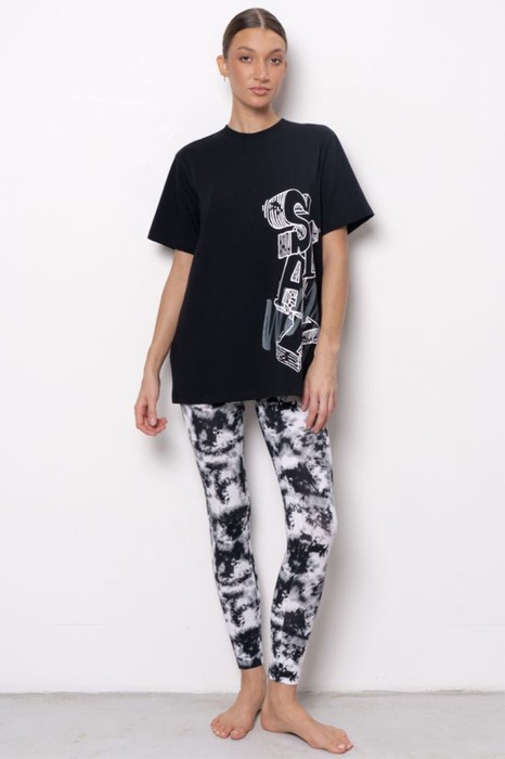 Комплект состоит из футболки с коротким рукавом свободного прилегания и брюк-лосин. Брюки–лосины с высокой линией талии. Эргономичный крой усиливает ощущение комфорта во время движений. Комплект уместен для занятий спортом, отдыха на природе, прогулок.
