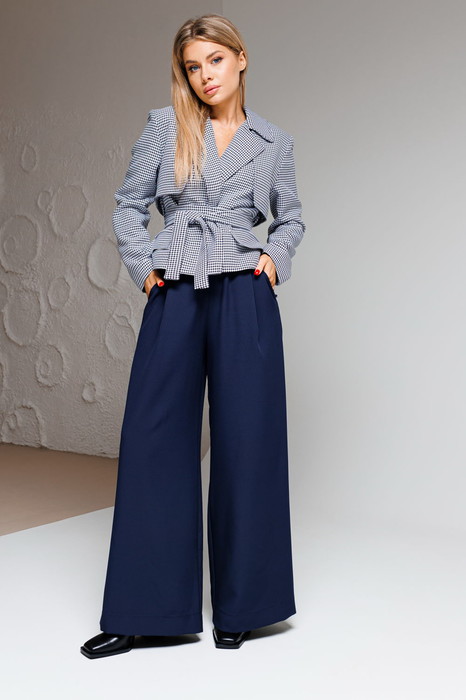 Брюки палаццо свободного кроя с притачным поясом на резинеке. В боковых шах прорезные карманы.