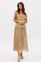 Жилет полуприлегающего силуэта, на подкладке. По переду рельефа карманы "листочки", застёжка на петли-пуговицы. По спинке вытачки.
