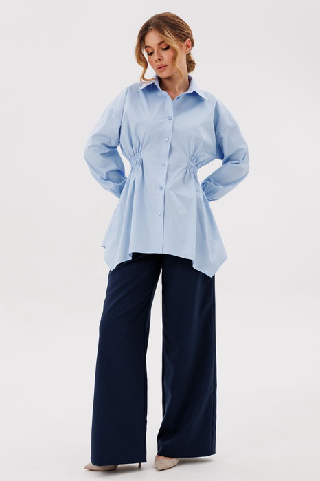 Рубашка женская А-силуэта, приталенная за счет резинки на кулисе. Рукав длинный на манжете. Низ фигурный.