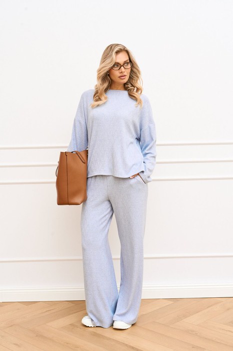 Элегантный брючный костюм в нежном цвете – идеальное решение для создания комфортного и стильного образа. Комплект состоит из свободного джемпера с длинными рукавами и широких брюк на эластичном поясе, что обеспечивает оптимальный комфорт при носке. Мягкая ткань с легким рубчатым текстурным узором добавляет изделию утонченности. Джемпер с округлым вырезом горловины, линия плеча спущена, рукав втачной, длинный, в боковых швах разрезы. Брюки-палаццо свободного силуэта, верхний срез обработан притачным поясом на эластичной тесьме, по боковым швам карманы с отрезным бочком. Этот костюм идеально подходит для релаксации дома или создания непринужденного образа для выхода в свет