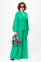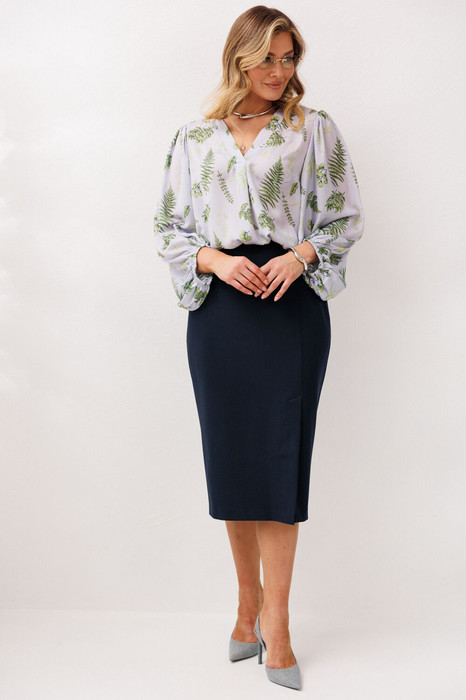 Бренд белорусской женской Anastasia представляет костюм двойку. Комплект женский 2-предметный (блузка и юбка) станет отличным дополнением к Вашему гардеробу. Подойдет для повседневной носки (работа, офис, прогулки). Блуза из шифоновой ткани, полуприлегающего силуэта. По полочке идет нагрудная вытачка из бокового шва. Вырез V-образной формы с планками и складкой по центру. По спинке средний шов, рукав объемный, по окату сборка. Низ рукава фигурный, на резинке. Юбка зауженная к низу, по полочке по линии колена - шлица. По спинке: средний шов, молния, пояс отрезной с резинкой. Длина спинки (блузки): -71 см. Длина рукава: -58 см. Длина юбки -75см