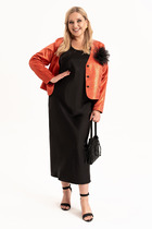 Комплект женский 2-х предмеиный ( пиджак, юбка) из 2-х видов ткани. Отдельные части комплекта лекго будут сочетаться с другими предметами вашего гардероба. Очень теплый пиджак прилегающего силуэта с баской на подкладке. По полочке прилегание создается за счет выточки по линии талии, по спинке- средний шов и выточки. Воротник пиджачного типа. По полочке идет отделка в виде хлястиков и клапана. Рукав втачной, 2-хшовный. Юбка-карандаш на подкладке. По спинке молния и шлица, в пояс вставлена резинка. Длина пиджака (по спинке)-58 см. Длина рукава- 61см. Длина юбки-63см.