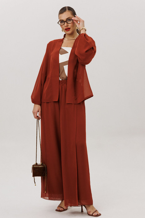 Элегантный вечерний костюм-двойка из шифона, состоящий из блузки свободного кроя и широких брюк. Красивый и эффектный брючный костюм - это идеальный образ для особых случаев, вечерних выходов, праздничных и торжественных мероприятий, будь то корпоратив, свадьба, юбилей, выпускной, день рождения, Новый год Блузка прямого силуэта из шифона со пущенной линией плеча. Рукав двойной, расширенный к низу со складками. По спинке и полочке идет планка. В комплекте с блузкой идет съемный пояс. На концах пояса металлизированная бахрома. Брюки прямые на трикотажной подкладке масло, с запахом по переду, пояс на резинке.Благодаря фасону и крою, костюм визуально вытянет силуэт, сделает фигуру стройнее, подчеркнет ее достоинства, скроет недостатки. Элегантный брючный костюм от Anastasia- комфорт и уверенность в себе на любом мероприятии Длина блузки: (48-56)-61см. Длина рукава-52см. Длина брюк:(48-54)-105см., (56)-108см.