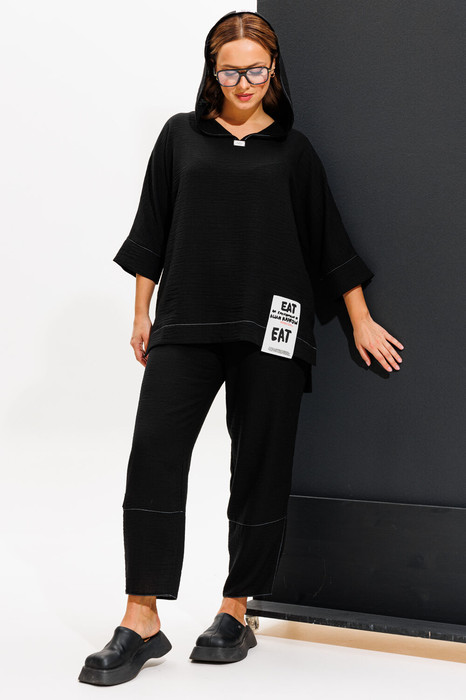 Комплект женский 2-х предметный (блузка, брюки). Модель из текстильной ткани. Комплкет легки и дышащий - идеальный вариант на лето. Отлично подойдет для повседневной носки. Блузка с капюшоном прямого силуэта с цельнокроенным руковом "летучая мышь", 3/4 длины с манжетой. Спинка длиннее полочки. По бокам разрезы. Брюки "бананы", пояс на резике, по бокам карманы.По низу брюк-подрезы. В качестве декора: по капюшону и полочке -нашивки, отделка в контраст ткани. Длина блузки (по спинке ): (48-52)- 70см. Длина рукава с манжетой от горловины: (48-52)-50см. Длина брюк: (48-52)-95см.