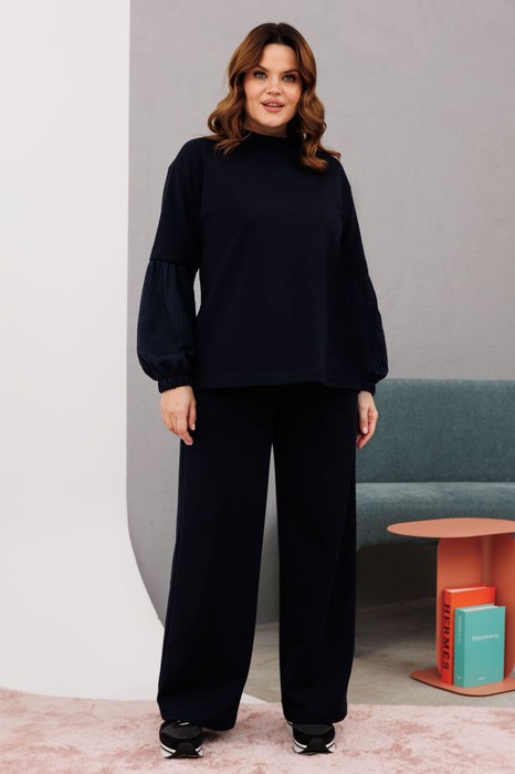 Шикарный трикотажный женский костюм от бренда Anastasia, идеальный для любого случая. Этот костюм сочетает в себе элегантность и комфорт, что делает его подходящим как для деловых встреч или домашней одежды, так и для праздничных мероприятий. Джемпер прямого силуэта со спущенным плечом. Полочка трикотажная. По спинке идет отрезная кокетка и вставка из отделочной ткани со встречной складкой по центру, низ фигурный. Воротник - стойка. По рукаву идет подрез из отделочной ткани. Сверху по подрезу сборка, низ рукава на резинке. Брюки прямые, пояс на резинке с завязками, по бокам карманы.Это не только универсальная одежда для деловых встреч или прогулок. Подойдет как для взрослых женщин, так и для подростков. Отдельный части костюма легко будут сочетаться с вещами из Вашего гардероба. Модель можно отнести к стилю спортивный кэжуал, спортивный шик. Костюм можно носить с кроссовками или ботинками. Обязательно добавьте наш бренд в избранное и следите за новинками, распродажами, скидками и акциями! Хороших покупок от «Анастасия» Длина джемпера (по спинке):(48-52)- 68см, (54-58)-71 см. Длина рукава: (48-52)-57см, (54-58)-59см. Длина брюк: (48-52)- 103см, (54-58)-106см