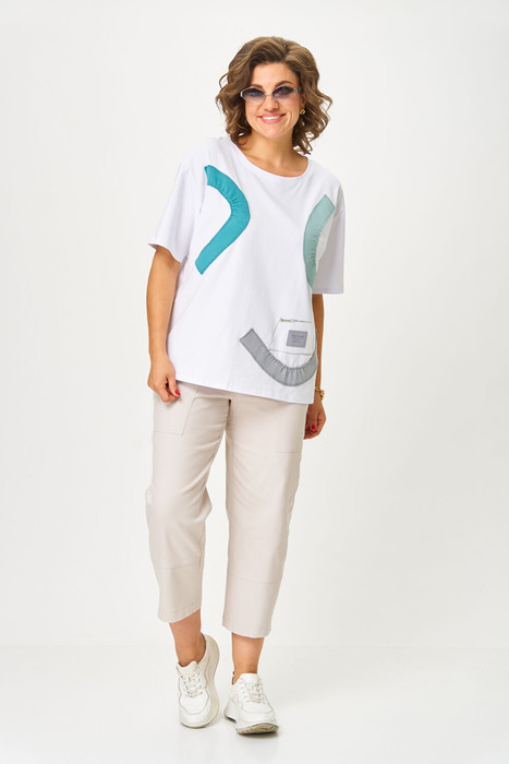 Оригинальный комплект от бренда Anastasia спортивного стиля станет незаменим в летнем гардеробе.  Отдельные части комплекта будут легко сочетаться с другими вещами.   Комплект женский 2-х предметный (футболка, брюки). Футболка прямого свободного кроя.  По полочке идут декоративные элементы в виде нашивок и темроаппликация. Брюки -бананы  7/8 , пояс на резинке. По передней и задней половинкам идет отрезная кокетка и по низу брюк- подрезы. Карманы накладные спереди.  Длина спинки: (50-54)-66см, (56-60)-69 см. Длина рукава:(50-54)- 24см, (56-60)-25см. Длина брюк: (50-54)-87 см, (56-60)-89 см