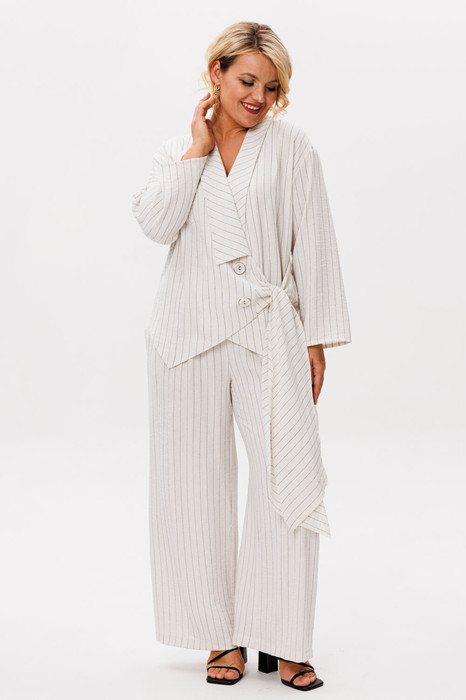 Оригинальный костюм от бренда Anastasia- идеальный выбор для любого случая. Этот костюм сочетает в себе элегантность и комфорт, что делает его подходящим как для деловых встреч, так и для праздничных мероприятий. Костюм женский 2-хпредметный (жакет и брюки) из текстильной ткани. Жакет прямого силуэта со спущенным плечом. Воротник распахнутый прямоугольный на отрезной горловине. В полочке ассиметричный низ, в качестве застежки - пояс-завязка. Спинка асимметричная с подрезом в виде скалдки. В качестве декора - пуговицы (по краю борта полочки и по складке спинки). Рукав одношовный. Брюки прямые, по передней части идет втречная скадка и боковые карманы. Пояс на резинке. Длина по спинке: (48-52)-70см, (54-58)-72см. Длина рукава: (48-52)-52см, (54-58)-53см. Длина брюк (48-52) -102см, (54-58)-103см