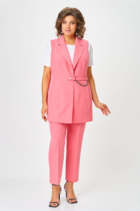 Жилет полуприлегающего силуэта, полочка жилета с вертикальными рельефами, с центральной застежкой на петлю и пуговицу. Горловина V-образной формы, воротник пиджачного типа с отложными лацканами. В рельефе полочки обработаны прорезные карманы. В области талии по полочке с левой стороны выполнен декоративный элемент в виде хлястика с пряжками, и цепью. Цепь сьемная. Спинка со средним швом и вертикальными рельефами. Жилет на подкладке.