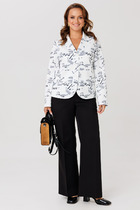 Брюки полной длины, прилегающие в области бедер и свободные в колене и по низу. Брюки со стрелками. По передним половинкам выполнены наклонные карманы. В левом боковом шве обработана застежка на потайную молнию. По талии брюки на притачном поясе с эластичной тесьмой и застежкой на петлю и пуговицу. По поясу брюк обработаны шлевки под ремень.