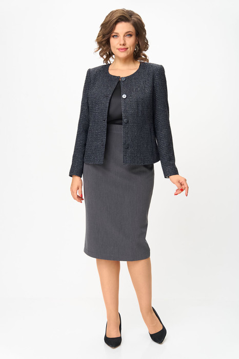 Комплект состоит из жакета и юбки. Жакет выполнен из твида, юбка из однотонной костюмной ткани.