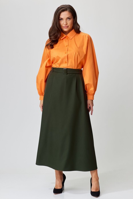 Юбка выполнена из костюмной ткани. Перед со складками и боковыми карманами. Спинка со швом посередине с застёжкой на тесьму-молнию и складками. Юбка на притачном поясе частично с эластичной тесьмой, с декоративным пояском с пряжкой спереди.
