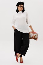 Брюки с завышенной линией талии на притачном поясе,застёжка на молнию по переду.Накладные карманы,входящие в боковой шов.Особенностью брюк являются разрезы по передним частям,кокетливо открывающие ноги внизу-настоящий хит наступившего сезона.