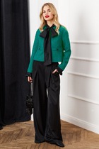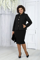 Жакет слегка приталенный, длиной до бедра, застежка на петлю пуговицу. Рукав длинный со шлицей, с декоративными пуговицами. Жакетный отложной воротник декорирован бархатной тесьмой. По переду прорезные карманы с клапаном. Жакет на подкладке. Подчеркнуть талию можно поясом.