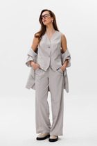 В комплект входят брюки, жакет и жилет. Сегодня сложно представить гардероб современной женщины без брючного костюма. Он актуален на всех мероприятиях, является базой офисной одежды и городской моды. Жакет двубортный, прямого свободного силуэта с втачными рукавами, отложным воротником и лацканами, функциональными прорезными карманами с клапаном. Спинка со средним швом. Жакет и жилет выполнены на подкладке. Жилет полуприлегающего силуэта, с рельефами по переду и спинке, v-образным вырезом горловины, застежкой на пуговицы, нерабочими карманами в рамку, по спинке регулируемый хлястик в области талии. Брюки классического покроя с завышенной линией талии, с боковыми функциональными карманами по переду, с притачным поясом. Комплект выполнен из однотонной ткани. Не упустите возможность приобрести комплект – он будет радовать вас не один сезон! Вся необходимая информация о производителе указана на этикетке. При съемке в образе использованы так-же швейные изделия бренда ANELLIstyle