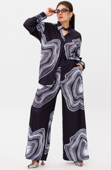 Этот костюм можно носить как вместе, так и по отдельности, комбинируя с другими элементами вашего гардероба. Необычная и стильная принтованная ткань привлекает внимание и делает вас центром притяжения в любом окружении.