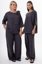 Брюки в стиле палаццо струятся с королевским размахом, подчеркивая женственность и комфорт. Мягкий пояс на резинке обнимает талию, не сковывая движений, а два боковых кармана делают образ не только стильным, но и практичным.