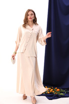 Блуза с изящной линией плеча и расширенным укороченным рукавом создаёт элегантную небрежность. Классический воротник с лацканами и накладные карманы добавляют стильную строгость, а застёжка на пуговицу и декоративный съёмный пояс позволяют играть с силуэтом.