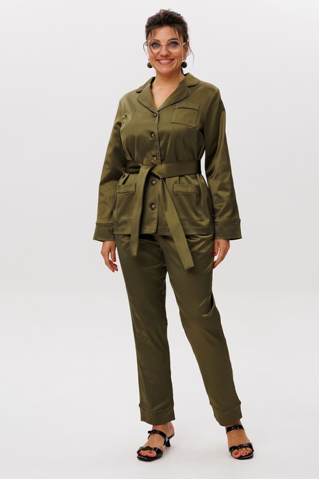 Функциональность сочетается с изяществом: блуза дополнена накладными карманами с фигурной обработкой кантом, а брюки — удобными врезными карманами. Съёмный пояс, завязывающийся на талии, позволяет подчеркнуть линию силуэта, добавляя ноту женственности.