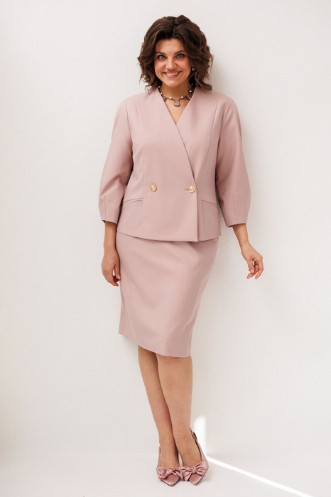Костюм в нежном пудровом оттенке «розовая зарянка» звучит спокойно и благородно, создавая образ, в котором сочетаются женственность, лёгкость и уверенная элегантность.
