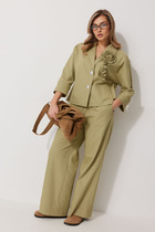 Полуприлегающий силуэт, красивые конструкторские линии плеча с сосборенным рукавом из ажурного кружевного полотна. Застежка по всей длине жакета на пуговицы.