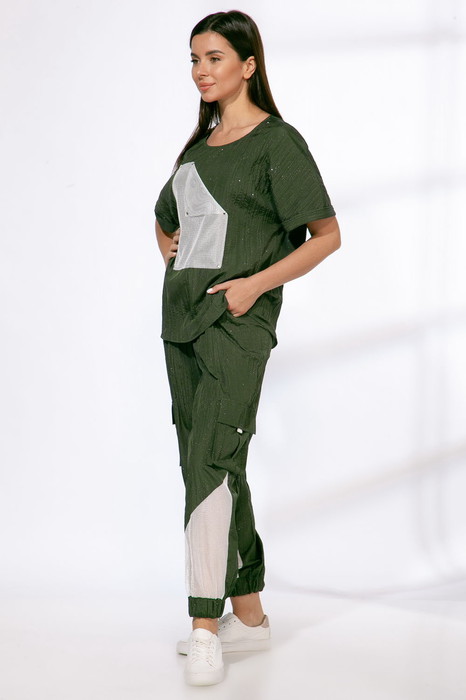 Костюм женский, состоящий из брюк и майки. Молодежные брюки спортивного, свободного стиля. Пояс собран на эластичную тесьму. По боковым швам в верхней части брюк расположены карманы"хулиганы", а в нижней части на уровне колена - накладные карманы с клапанами. Низ брюк собран на эластичную тесьму.Блузка выполнена из легкой трикотажной ткани в сочетании с легкой сеткой, придающей образу романтичности. По переду блузки выполнен декоративный элемент из сетки, в виде отвернутого накладного кармана.